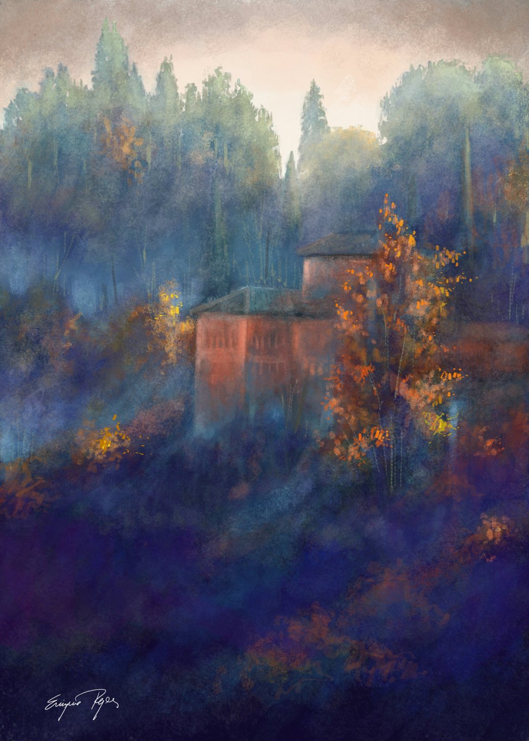 Realizado simulando la técnica mixta a caballo entre el lápiz de color y la acuarela.