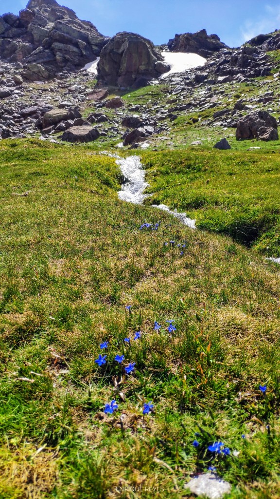 Ya en el tramo final, pasamos por la acequia de Papeles y la Hoya de la Alberca, un rincón donde el verde toma el protagonismo en plena primavera. El paisaje más grandioso ha quedado atrás. Las chorreras, la impresionante vegetación que renace bajo el hielo como la espectacular Genciana de Primavera empieza a asomar en ramilletes coloridos de azules pétalos, siempre a orillas de cualquier reguero de agua gélida.